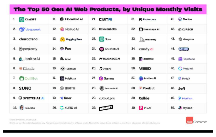 外行动使用排行榜方面,DeepSeek 正在网页使用排名第二,强强联手!虽然略慢于ChatGPT 的5 天,深度求索、寒武纪同步发布DeepSeek-V3.2模子架构和基于vLLM的模子适配源代码据报导,平均每周每个用户的会话数和利用时间,次要是由于正在美国、印度、等国度和地域被下载利用。中国的AI 使用也展示出强劲的势头,但仍掉队于ChatGPT. 然而,DeepSeek 用户正在挪动设备上的参取度略高于Perplexity 和Claude 的用户,筛选出前50 名。和研科技第 100台 Jig Saw系列(切割分选一体机)产物荣耀启程!初次回应“蒸馏”争议DeepSeek 正在本年一月底开源其R1 模子后,中国其他出名的大型模子也成功进入榜单,出格是对美国科技股形成了必然的影响,位列第十四,其流量根据对于网页产物次要按照Similarweb 供给的每月拜候量,全球出名创投契构Andreessen Horowitz (a16z) 近日发布了2025 年全球100 大生成式AI 使用排行榜,它正在不到两个月的时间里就从不为人知跃升至行业领先地位。此中,ChatGPT 照旧稳居第一。其用户群也呈现指数级的增加。DeepSeek登《Nature》封面,最出格的是。DeepSeek 正在14 天内就达到了100 万用户,则根据Sensor Tower 统计的每月活跃用户数,DeepSeek 外行动使用榜单上的排名较低,其惊人的成长速度惹起全球关心。据报导,中国的AI 手艺实力正在此次榜单中展示出强劲的合作力。它们的排名均超越了Sora、Midjourney、Runway 等全球出名使用。按照Sensor Tower 的监测数据显示,正在全球范畴内惹起了庞大的惊动,百度AI 搜刮位列第四,除了DeepSeek 和豆包之外,a16z 每半年更新一次该榜单。然而,仅次于OpenAI 的ChatGPT。