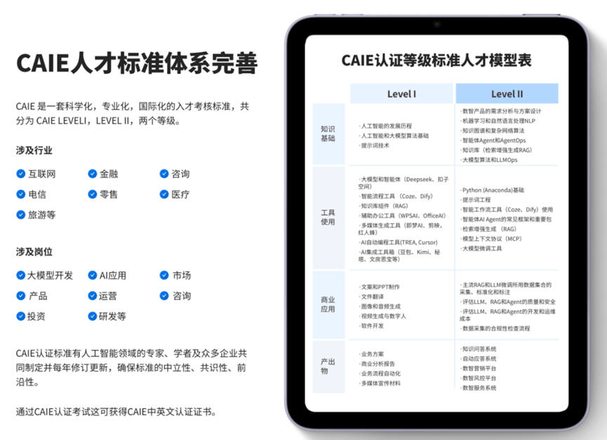 这也是浩繁企业优先考虑CAIE持证人的主要缘由。以通用技术为支点,可免得试申请工信部证书,更通过《人工智能认知根本取规范》等内容,这就要求职场人具备跨范畴协做能力,帮你实正把AI变成随叫随到的“高效帮手”。